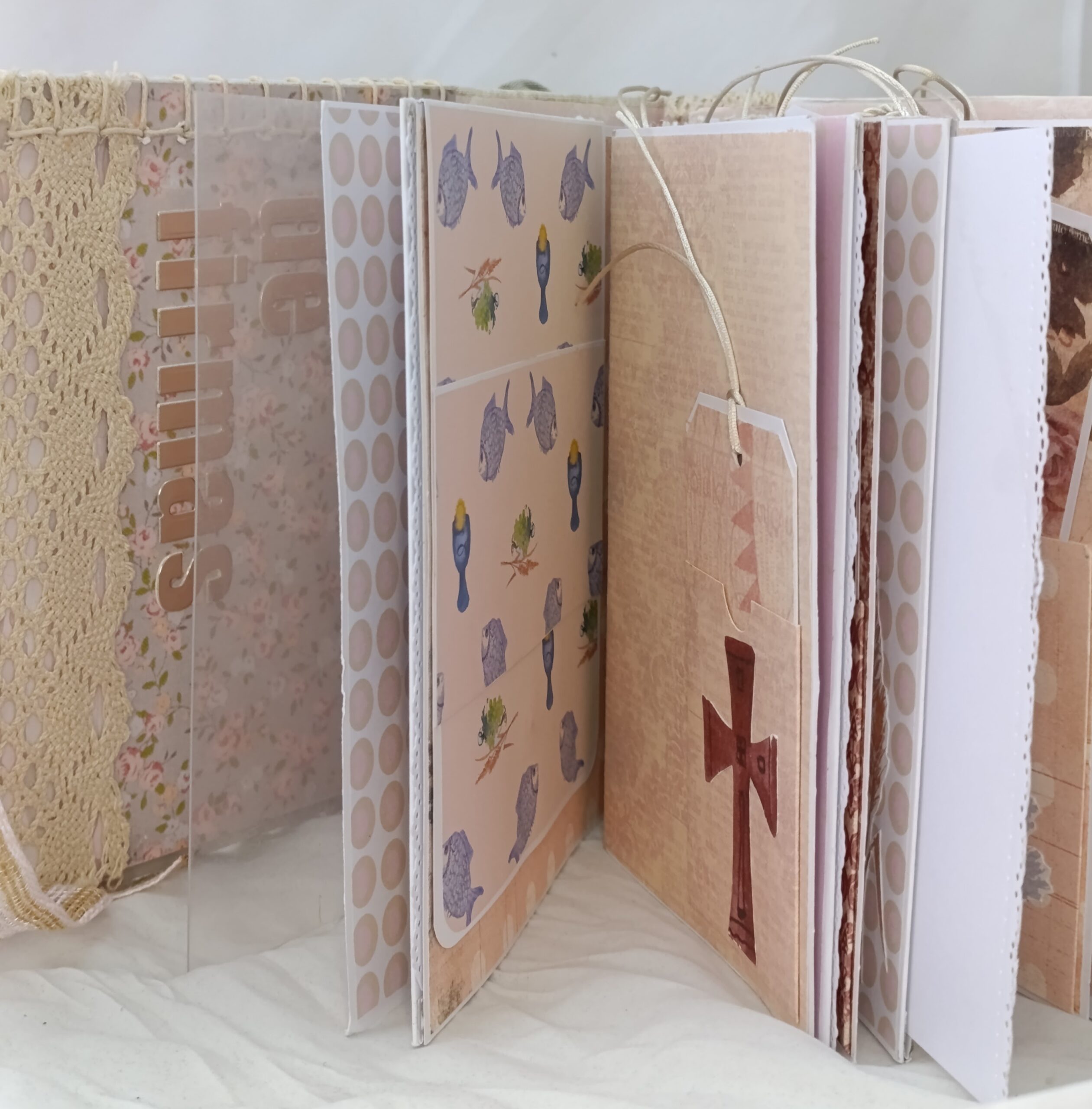 5 hojas desplegables con estructuras, bolsillos y tarjetones extraíbles para poner fotos o textos.