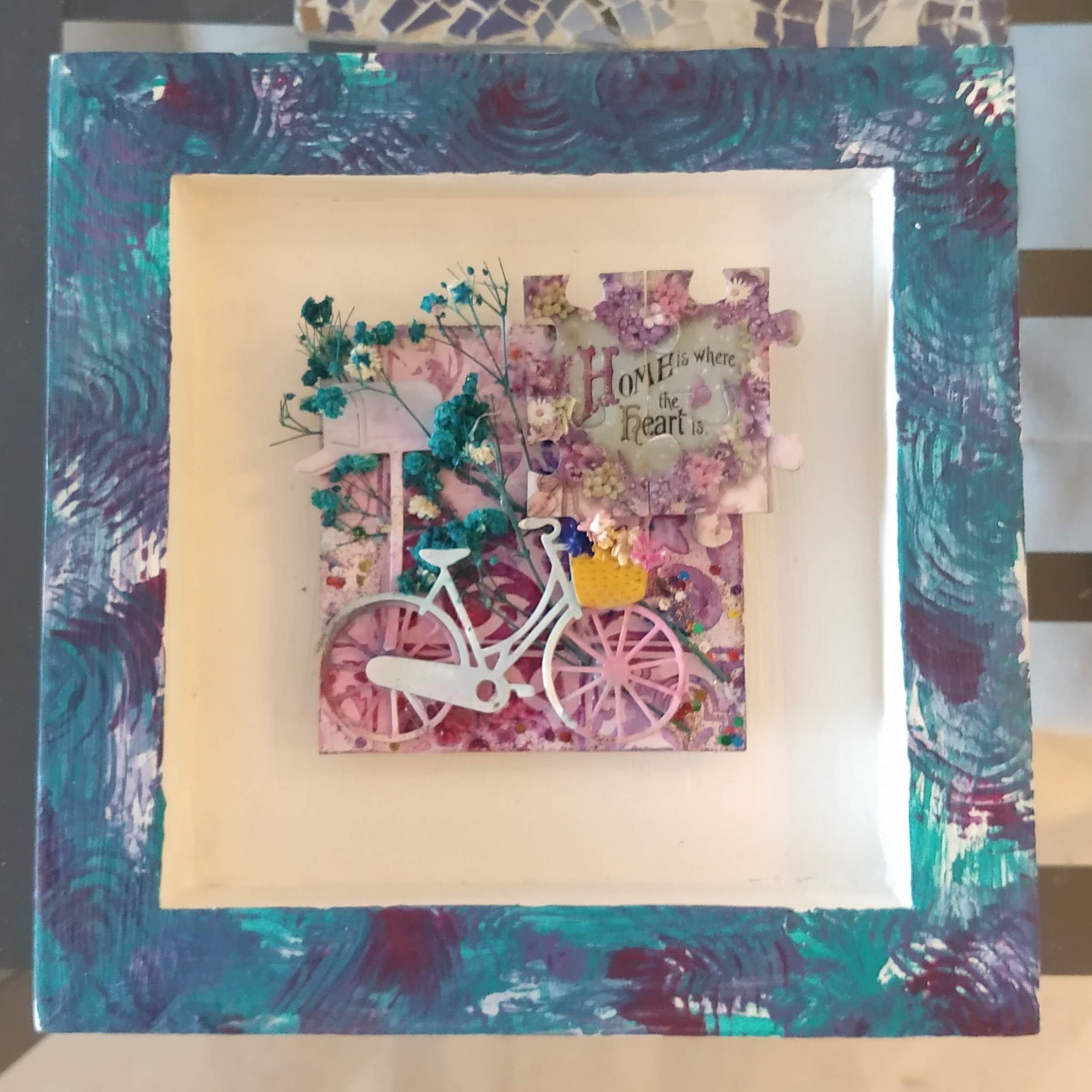 Cuadro infantil, tonos malva y azul turquesa con bicicleta.