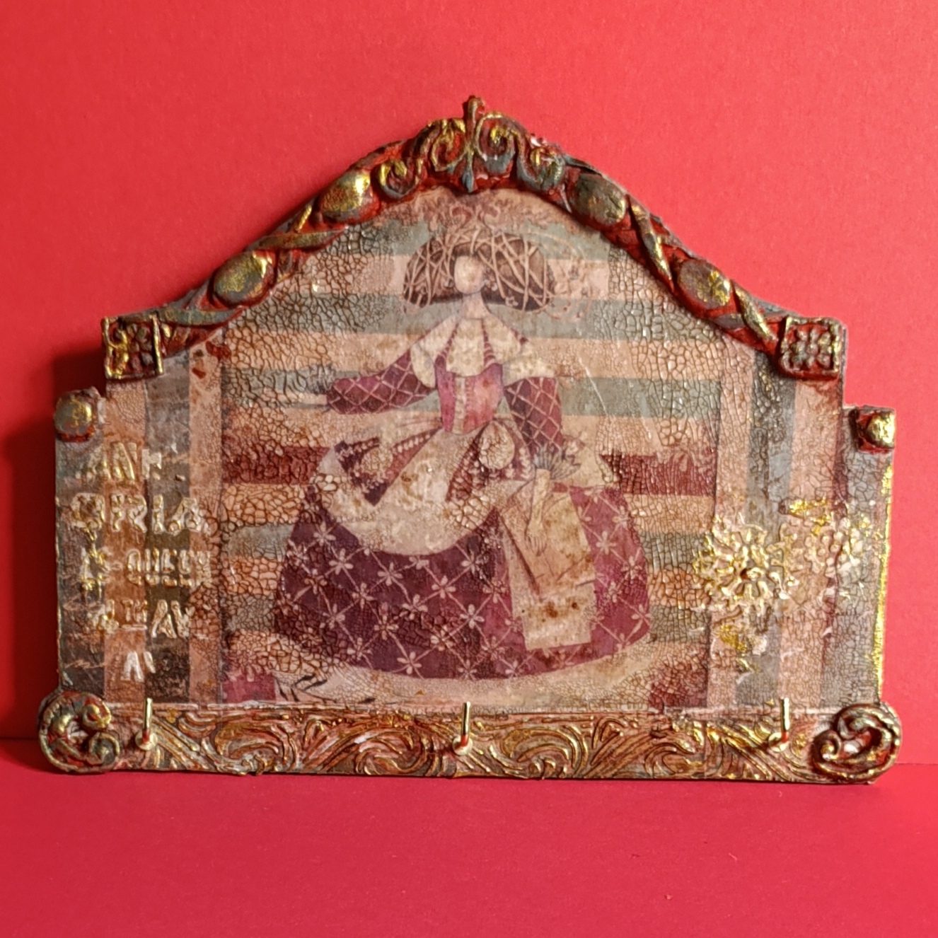 Cuelgallaves madera, con menina. Decorada con decoupage y molduras, tonos verde, rojo y oro